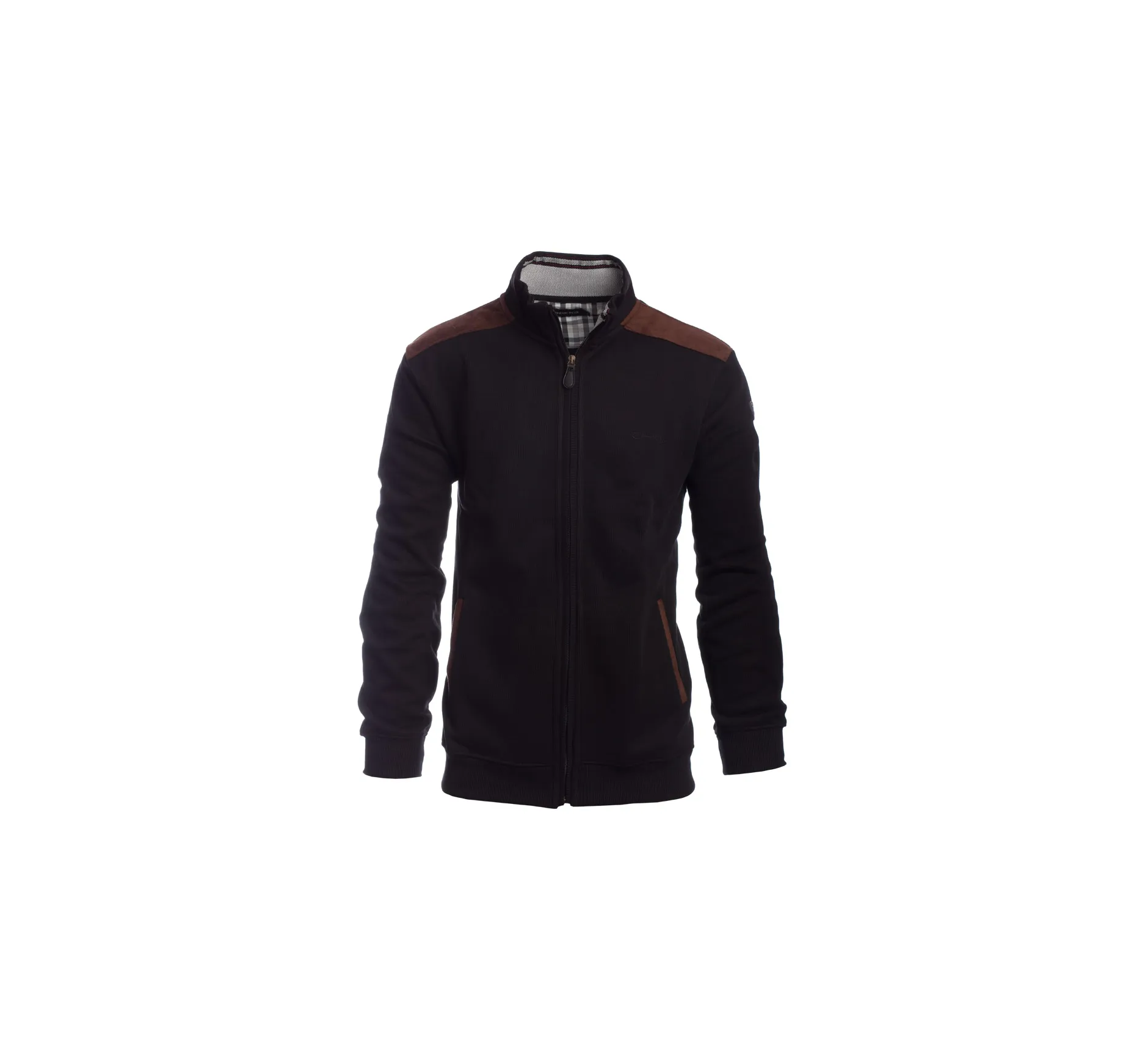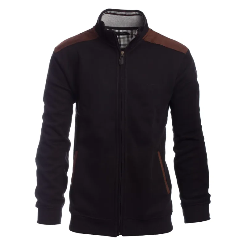 Discover the black jacket, model S6557, that blends style and comfort. Its brushed interior provides warmth and softness, while the brown suede-like insert adds character. Featuring two practical pockets, a snug hem, and a classic, non-fitted cut, this jacket is made from 50% cotton and 50% polyester for lasting durability.