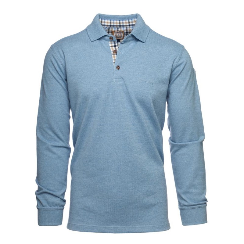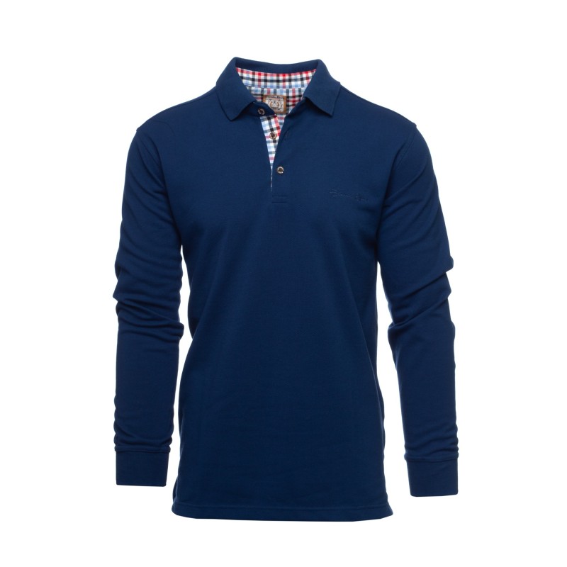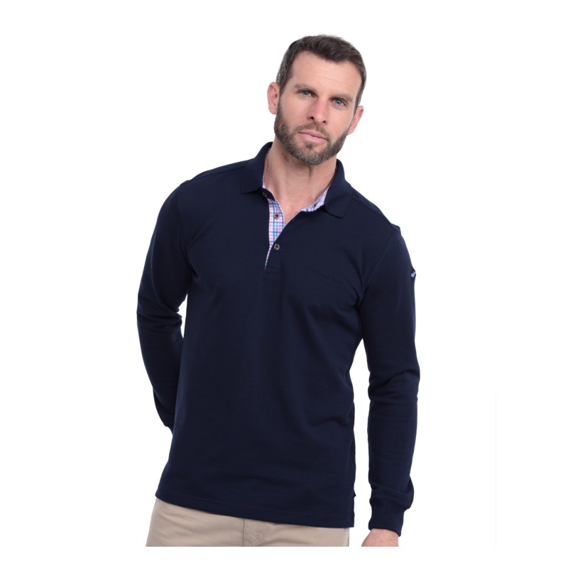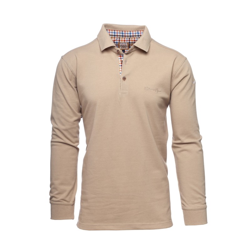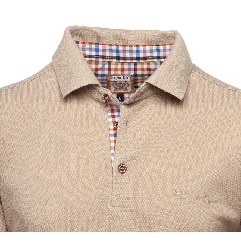 Discover our long-sleeve pique knit polo, designed to combine comfort and durability. Made from a blend of 50% cotton and 50% polyester, this bright beige polo offers exceptional breathability, ideal for any season. The placket is delicately enhanced with a coordinated check fabric, adding a distinctive touch of elegance. Perfect for those seeking style and comfort in their daily wear.