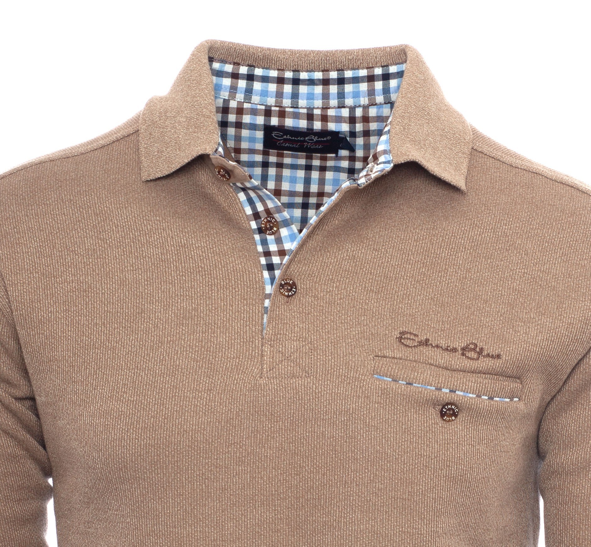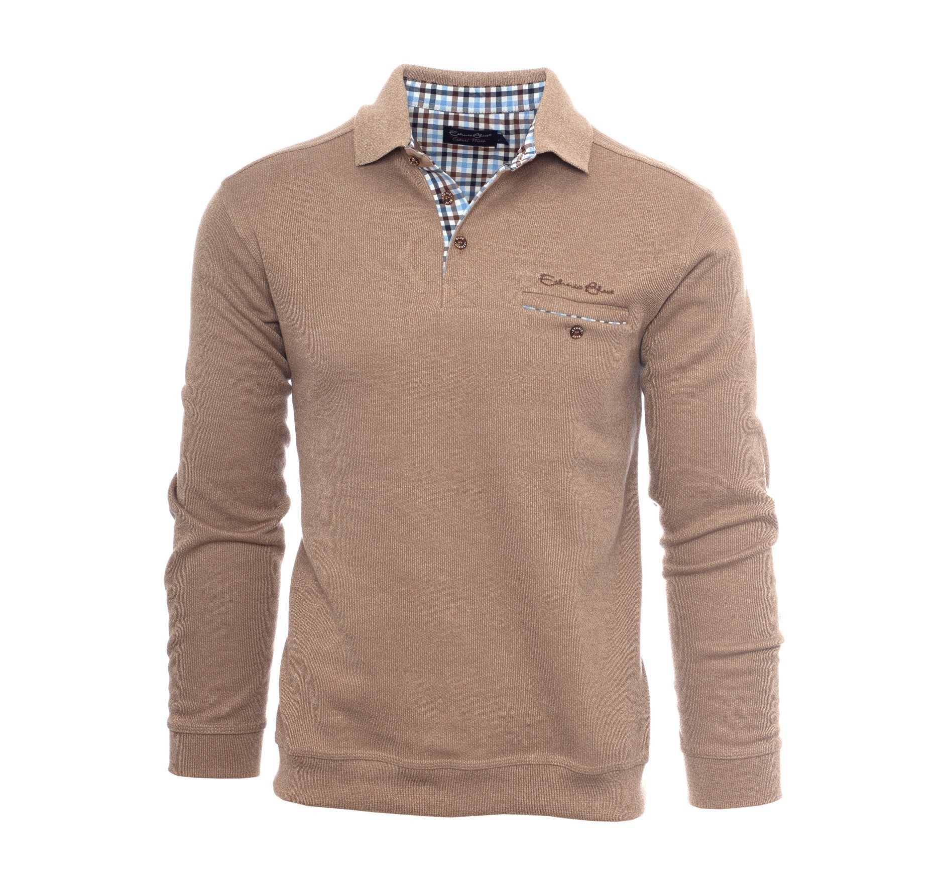 Introducing our long-sleeve pocket classic polo in Blue melanged color, crafted in Portugal. This high-quality fleece polo (50% cotton, 50% polyester) offers optimum comfort with its brushed interior. The understated design is elevated with a plaid button placket and a one-button chest pocket.