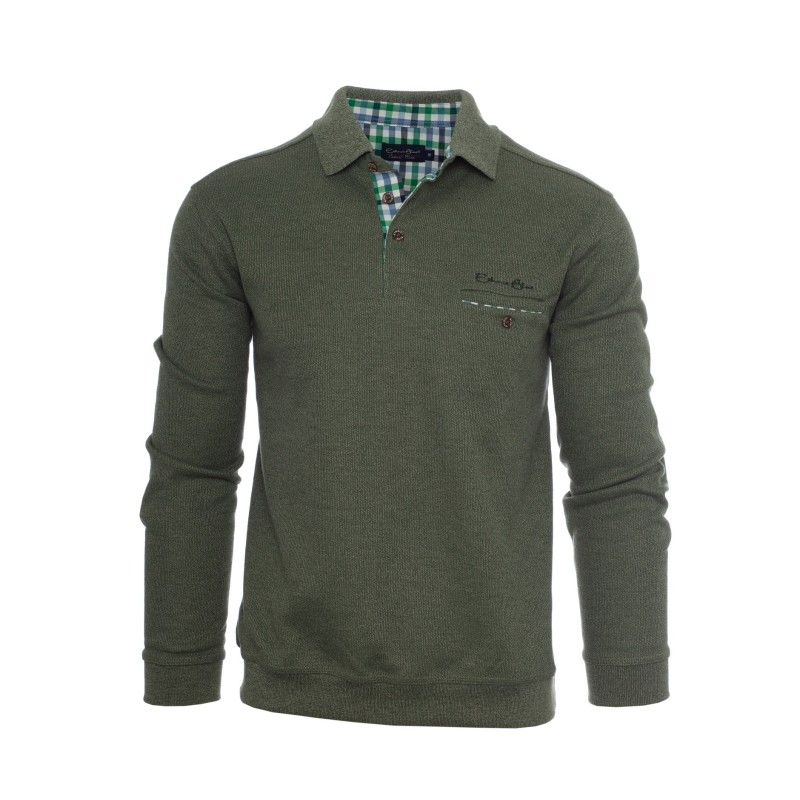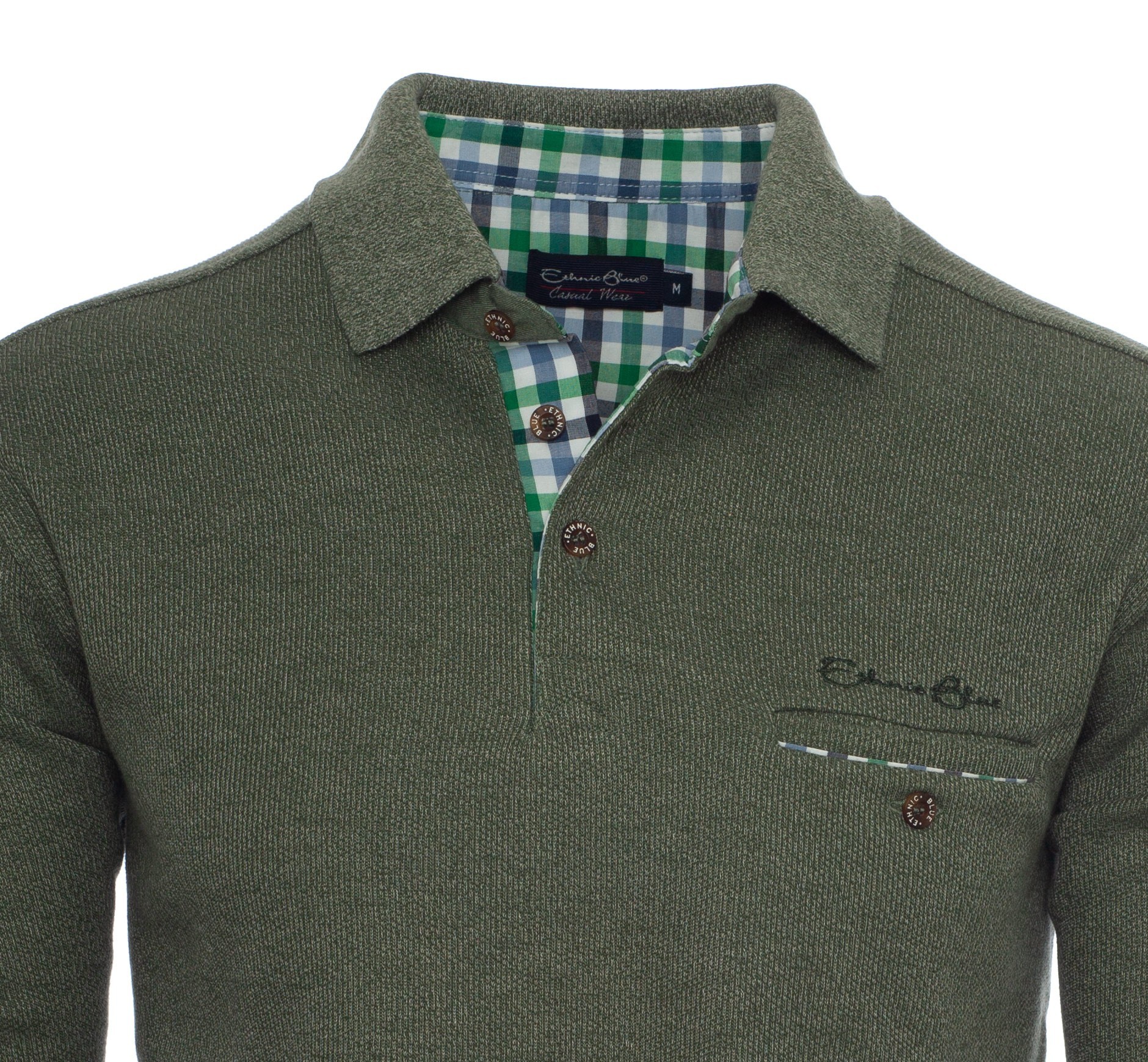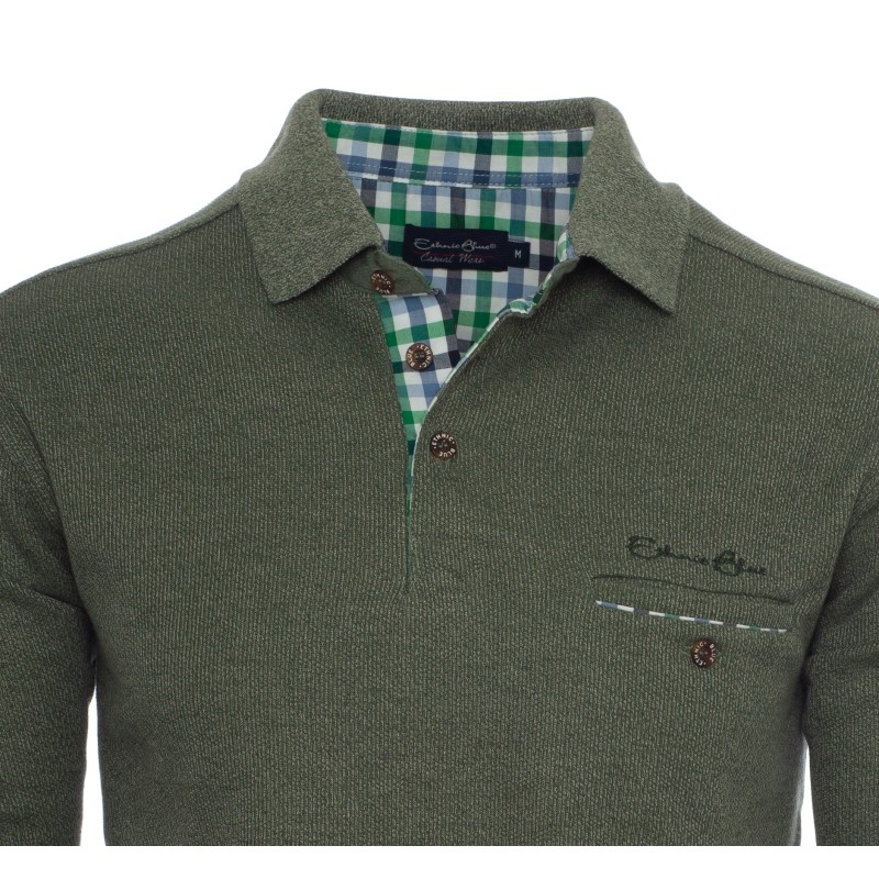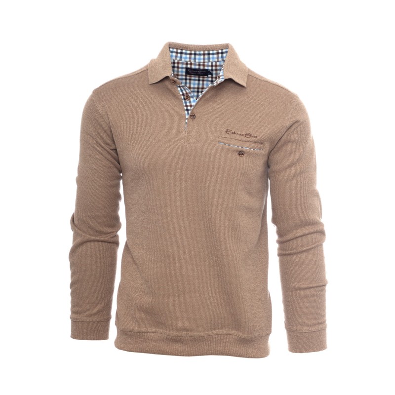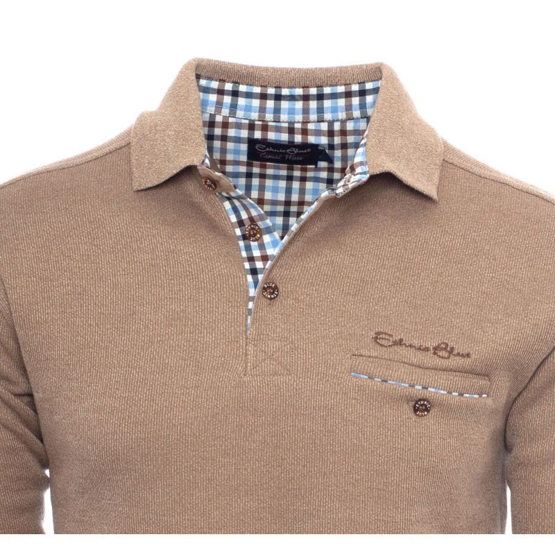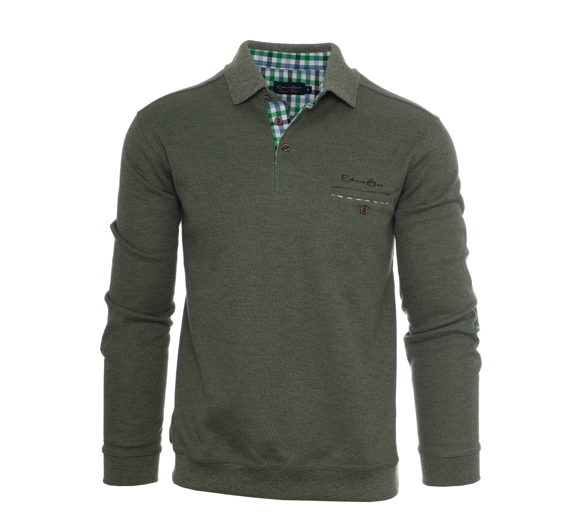 Introducing our long-sleeve pocket classic polo in Blue melanged color, crafted in Portugal. This high-quality fleece polo (50% cotton, 50% polyester) offers optimum comfort with its brushed interior. The understated design is elevated with a plaid button placket and a one-button chest pocket.