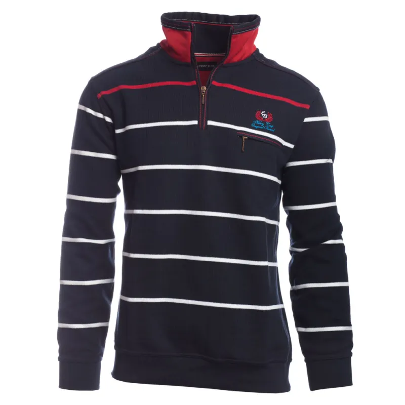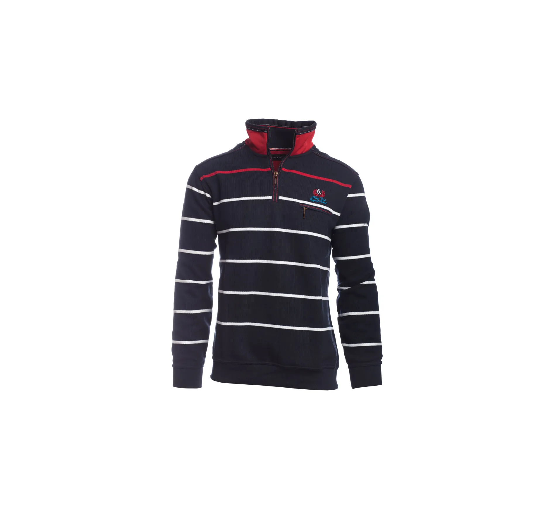 This striped half-zip sweatshirt offers the perfect balance between everyday comfort and refined casual style. Crafted from a soft yet durable knit, it features a brushed interior that provides exceptional warmth and a pleasant feel when worn. Its classic fit makes it easy to pair with any outfit while maintaining a polished appearance.