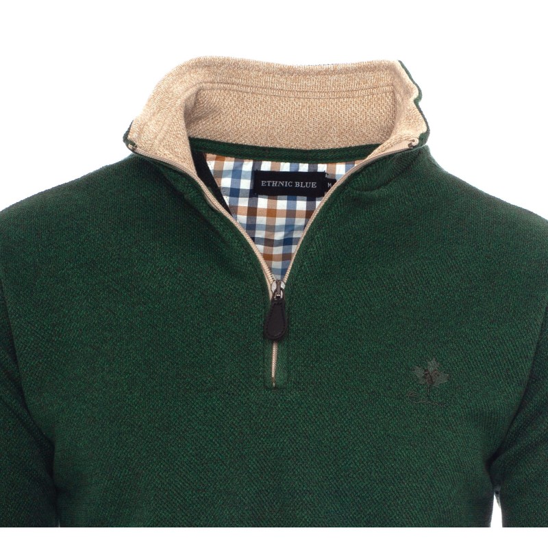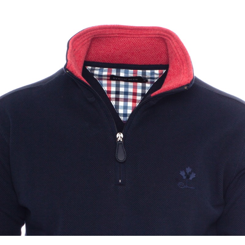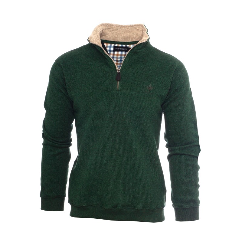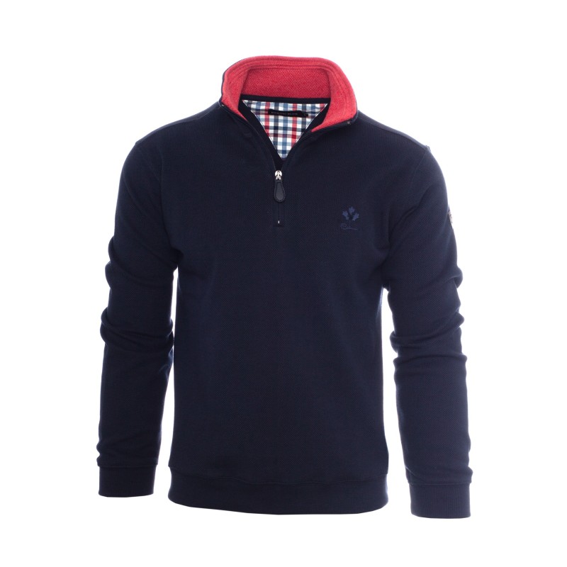 This zip-collar sweatshirt combines elegance and comfort with its exclusive thick piqué knit. The brushed fleece interior provides warmth while remaining breathable. Its fitted cut with an elasticated hem ensures a perfect fit, while refined details like the tone-on-tone embroidery and contrasting collar add a sophisticated touch. Carefully crafted in Portugal, it’s perfect for a casual yet refined style.