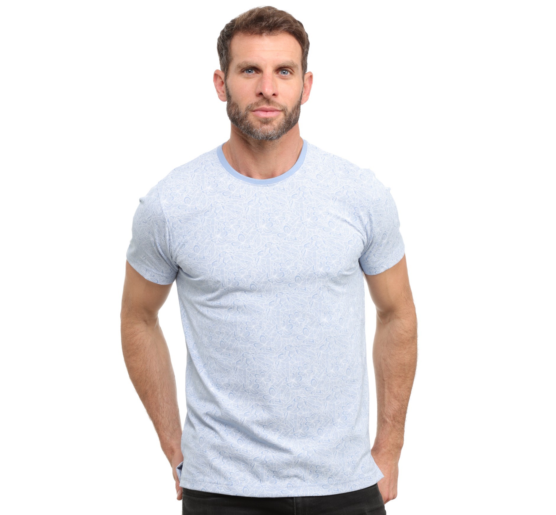 Embrace the perfect blend of comfort and subtle elegance with our tone-on-tone floral print T-shirt. Designed for men who value understated sophistication, this jersey tee made from a blend of 50% cotton and 50% polyester ensures outstanding durability without compromising on softness. Ethically produced in Portugal at our own facility, each shirt is a testament to our commitment to exceptional quality and the well-being of its wearer. Lightweight and breathable, it's the quintessential addition to your summer wardrobe.