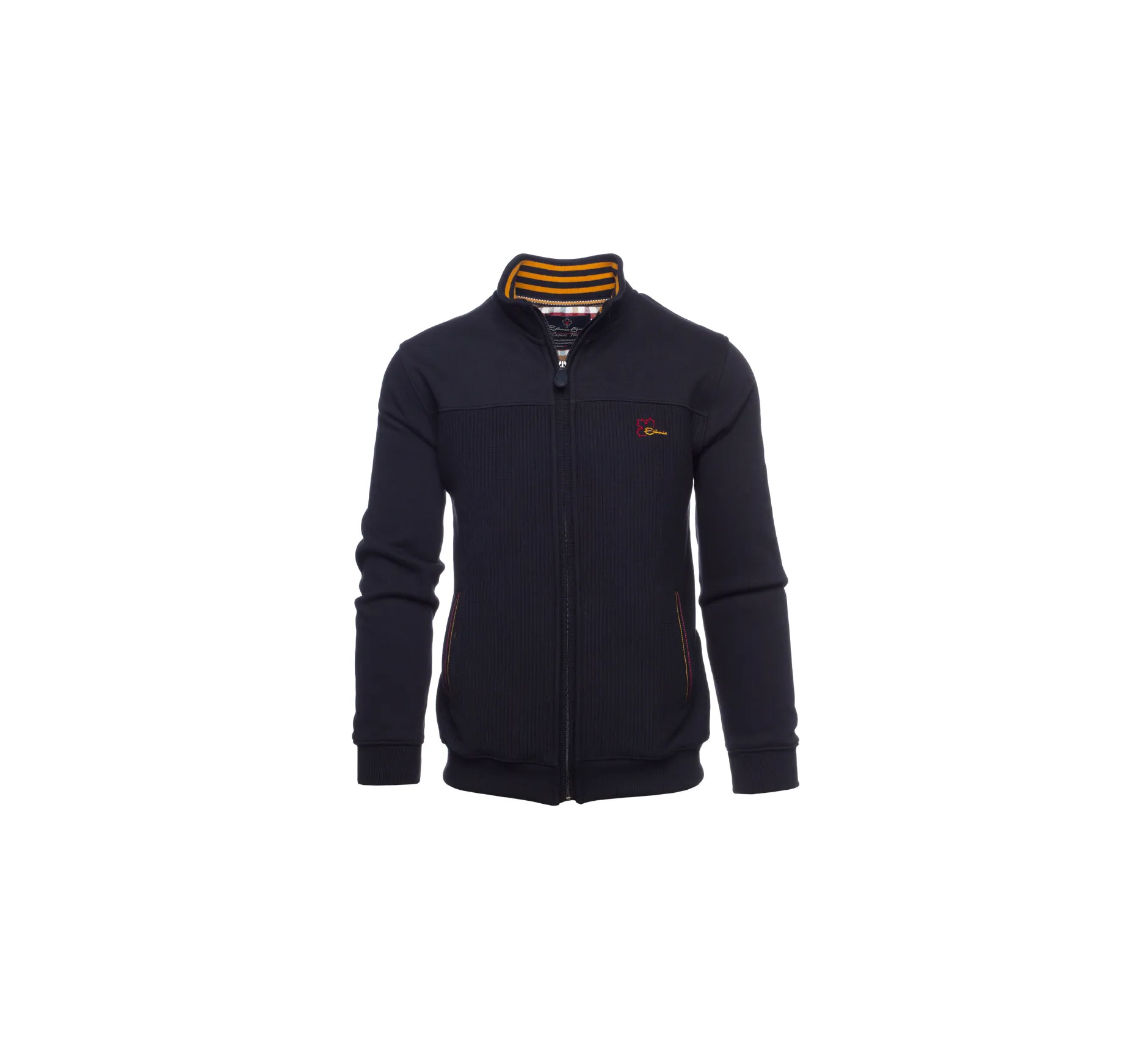 Cette jolie veste est confortable et stylée, vous ne pourrez plus vous en passer ! Vous allez aimer le mélange des deux matières : la première en maille ottoman verticale et la seconde sur les manches, le dos et l'empiècement devant en maille style sweat marine. Les rayures à l'intérieur du col et sur les poches lui confère un style très élégant.