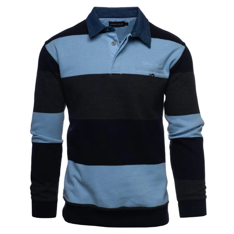 Alliant sophistication et confort, notre polo en maille sweat rayé ciel anthracite et marine est la pièce incontournable de votre garde-robe. L'intérieur gratté de la maille offre une douceur inégalée, tandis que ses détails distinctifs, comme le col en denim et la poche boutonnée ornée d'un liseré, apportent une touche moderne et tendance.